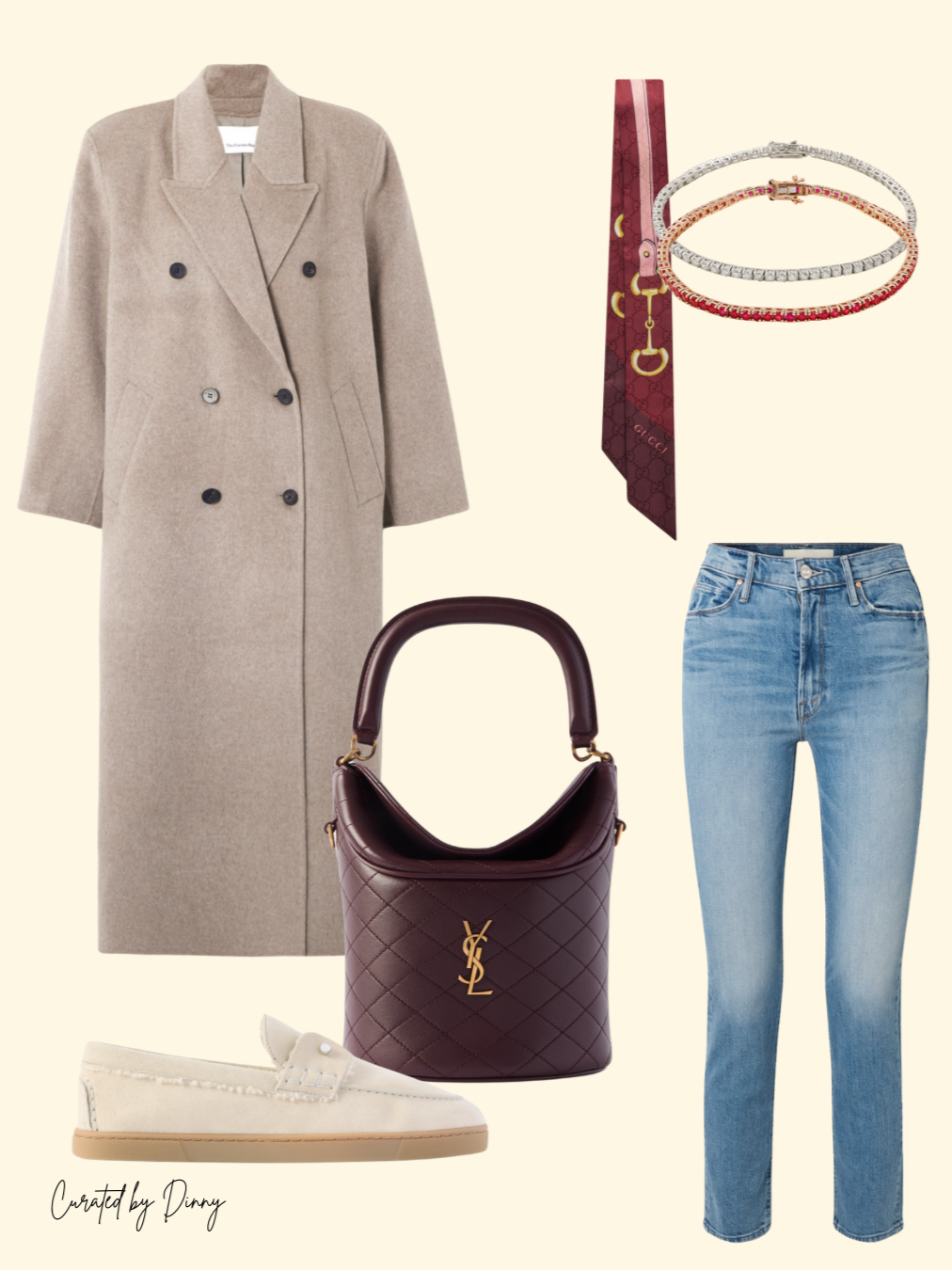 To add depth, I chose deep burgundy accessories the YSL bag and the subtle pop of red in the bracelet and scarf.